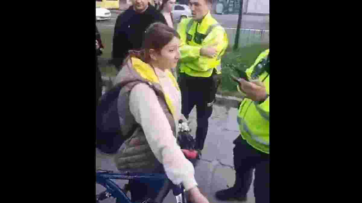На відео видно, як натовп поліцейських, зокрема велопатрульних, валить дівчину на землю, одягає кайданки і веде в бус. Дівчина чинить опір, а її ...